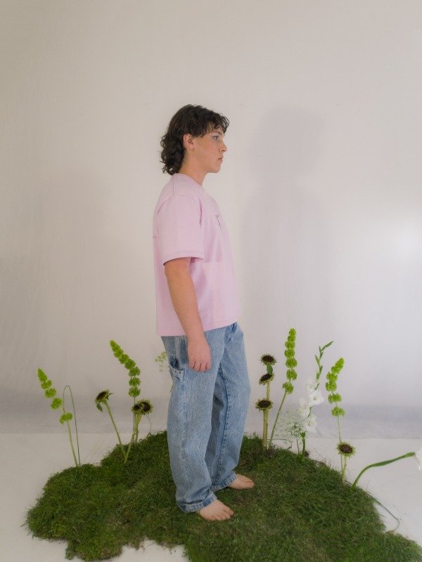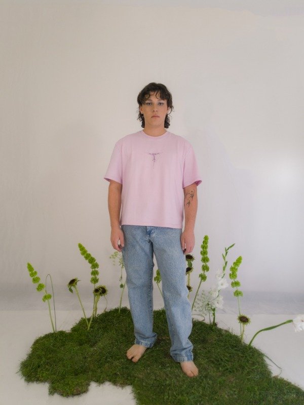 Remera corte semi-boxy manga corta casi 3/4 con cuello normal base. Disponible en 2 talles, adaptables a varios talles.